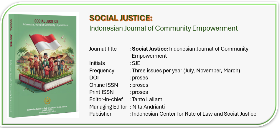 Social Justice: Indonesian Journal of Community Empowerment is a publication media for research-based community service results and independent service that is structured, integrated and systemised. This scientific journal is a medium for disseminating intellectual works that impact increasing the commitment to a democratic rule of law and strengthening the protection of human rights based on the principles of fair justice, equality, participation, independence, and sustainability. Articles published in this journal are related to Empowerment in the legal, social, political, human rights and gender, economic and development, and community engagement related to increasing understanding in the other social humanities.